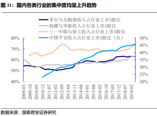行业集中度提升趋势在各行业均已经体现。以白酒、水泥、工程机械、保险行业为例,贵州茅台、海螺水泥、三一重工、中国平安等龙头公司营收占所在行业的比例近10年呈上升趋势,行业集中度提升在上游周期,中游制造,大消费和金融行业均已经发生。