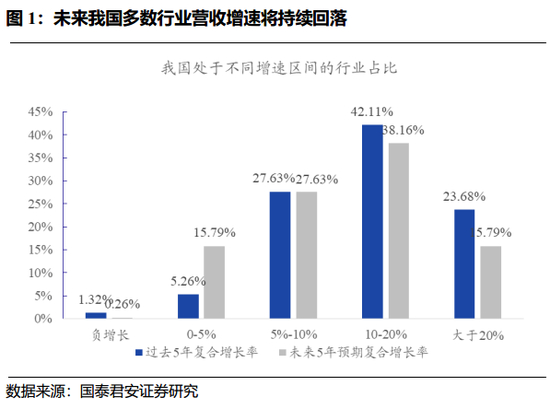未来行业增长率将回落,国内增量市场开始转向存量竞争。我们通过问卷调查形式,整理了国泰君安证券研究所29个行业首席分析师观点,涉及国内76个集中度提升潜力较大行业,包括对标海外市场发展历史及国内市场展望。问卷数据显示(除非特殊说明均为问卷数据,下同):过去5年,24%的行业营收增长率大于20%,未来5年将降至16%;过去5年营收增速小于5%的行业占比为7%,未来5年则升至16%。