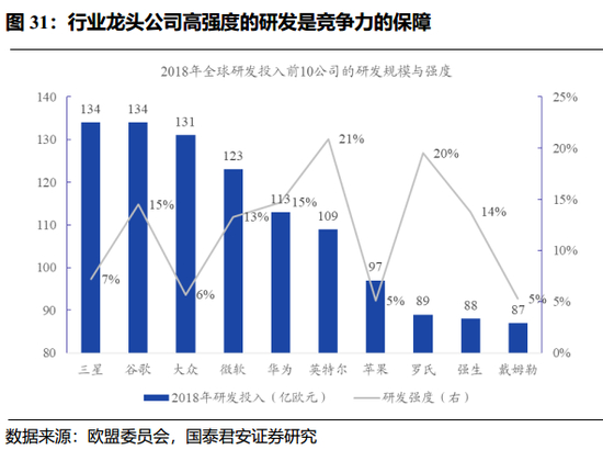 技术与产品优势可以通过研发投入评估。根据欧盟委员会公布的《2018年欧盟工业研发投资排名》,三星、谷歌、大众、微软、华为位列5名。全球研发投入前10的公司,其研发投入占营业收入的比例均高于5%,体现了较高研发强度。这些公司是全球半导体、互联网、汽车、云计算、电信设备等领域的龙头公司,其研发投入是产品竞争力的保障。