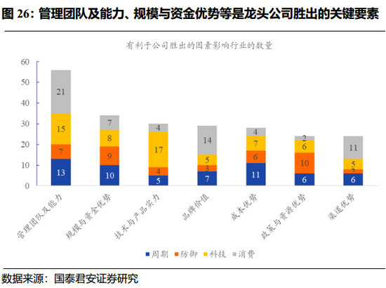 龙头公司胜出的决定性因素各不相同。(1)产品与技术优势对科技板块影响较大;(2)规模与成本优势对周期板块影响较大,(3)品牌与渠道优势对消费板块影响较大,(4)资金与管理优势对防御板块影响较大。