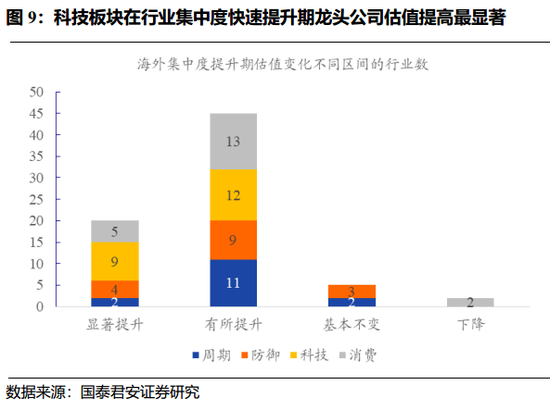 估值提升来看,海外市场行业集中度快速提升期,龙头公司估值提高在科技板块最显著。(1)科技板块43%的行业在集中度快速提升期龙头公司估值显著提高,包括光伏、云计算中心、物联网硬件、协同办公软件等。(2)约25%的防御和消费板块龙头公司估值显著提高,包括防御行业的基建、垃圾焚烧,及消费行业的零售药店、餐饮。科技板块行业集中度提升后,仍有望保持较快增速,且龙头公司成长确定性强,因此估值明显提高。防御和消费板块龙头也受益于市场格局清晰,成长确定性带来的估值提高。