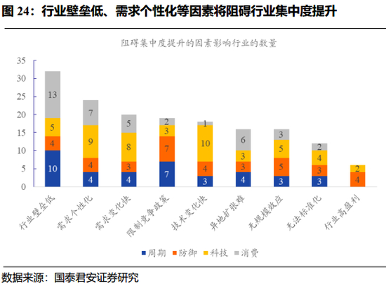 行业壁垒低、需求个性化等因素将阻碍行业集中度提升。问卷数据显示,根据各阻碍集中度提升的因素影响的子行业数量,行业壁垒低、需求个性化、需求变化快、限制竞争政策、技术变化快、异地扩张难、无规模效应、无法标准化、行业盈利较好为主要的阻碍集中度提升的因素。
