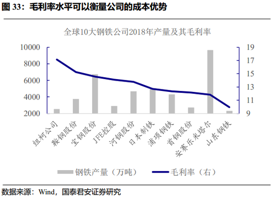 成本优势可以通过比较毛利率判断。美国纽柯公司毛利率高达17.14%,为全球10大钢铁公司中毛利率最高的,而美国钢铁毛利率仅为13.21%。纽柯公司和美国钢铁2018年营业收入分别为251亿美元和142亿美元,但总市值分别为166亿美元和22亿美元。纽柯公司的成本优势显著,使得资本市场给予其显著更高的定价。