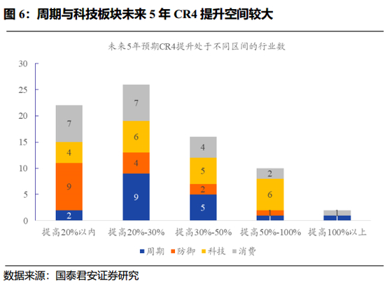 科技与周期板块未来5年集中度提升空间较大。科技板块中,52%的行业未来5年CR4将提升超过30%;周期板块,39%的子行业CR4将提升超过30%。周期性行业中的焦炭、钢铁等行业环保监管趋严,落后产能较快退出,政府着力于推动行业整合。科技行业中,IDC、协同办公软件等行业龙头公司已经在规模具有明显优势,市场份额有望进一步提升。