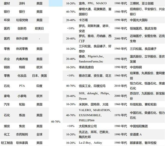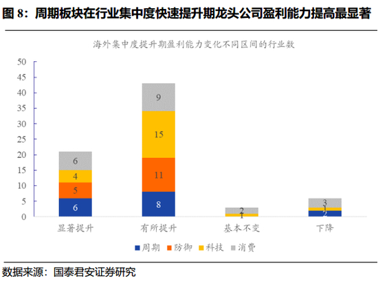 盈利能力提升来看,海外市场行业集中度快速提升期,龙头公司盈利能力提升在周期板块最显著。(1)周期板块33%的龙头公司盈利能力显著提升,包括电解铝、铜加工、防水材料、涂料等。(2)约30%的防御和消费板块龙头盈利能力显著提高,包括防御行业的基建、商业地产,及消费行业的小家电、酒店。周期和防御板块,龙头公司规模效应效率提升,且市场垄断导致较高的盈利能力。消费板块,龙头公司则受益于规模效应,及行业竞争弱化使广告投入力度降低,公司对消费者议价能力提升。