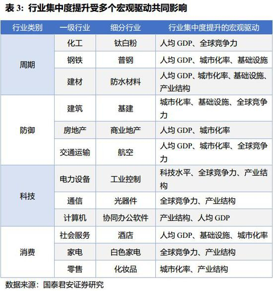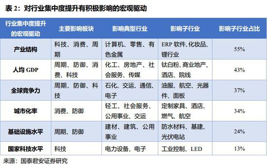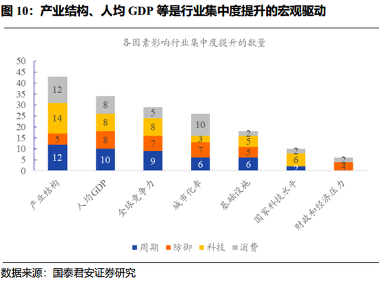 产业结构、人均GDP和城市化率是影响行业集中度提升最广泛的宏观驱动。产业结构对科技、消费和周期板块影响较大,人均GDP对周期、防御、消费、科技4大板块均有影响,全球竞争力主要影响周期、防御、科技板块。