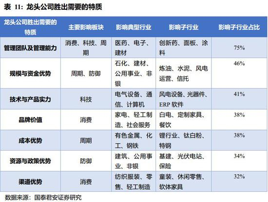 管理团队及管理能力、规模与资金优势均对至少2个板块的龙头公司胜出有重要影响。管理团队及管理能力对消费、科技和周期板块龙头公司胜出均有重大影响,规模与资金优势对周期和防御板块龙头公司胜出影响较大。下表列出了公司特质对龙头公司胜出的影响。