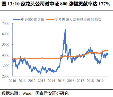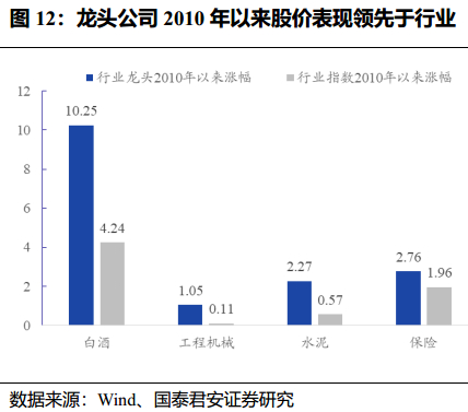 龙头公司股价领先于行业和市场整体。2010年初至2019年11月12日,贵州茅台、海螺水泥、三一重工和中国平安分别上涨10倍、1倍、2倍和3倍,同期白酒、水泥、工程机械和保险行业指数分别上涨约4倍、10%、60%和2倍,龙头公司的涨幅均领先于行业。2010年以来中证800指数上涨约430点,涨幅约12%,招商银行、贵州茅台、中国平安、五粮液、万科A、上海机场、长江电力、万华化学、海螺水泥、格力电器等10个行业龙头公司拉动指数760点,对指数涨幅贡献率达177%。