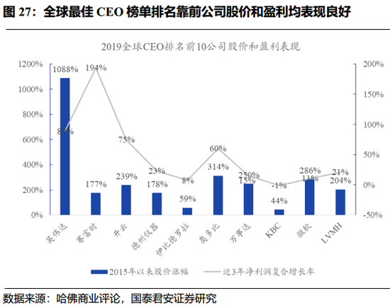 优秀的管理能力对公司股价和盈利表现均有积极作用。《哈佛商业评论》评选的2019年全球最佳CEO榜单中,位居前10名的CEO所在公司2015年以来股价表现普遍较好,最佳3年盈利也大多保持稳定增长。如排名第一的黄仁勋所在的英伟达公司2015年以来股价上涨11倍,近3年营收和净利润复合增速分别为33%和89%。