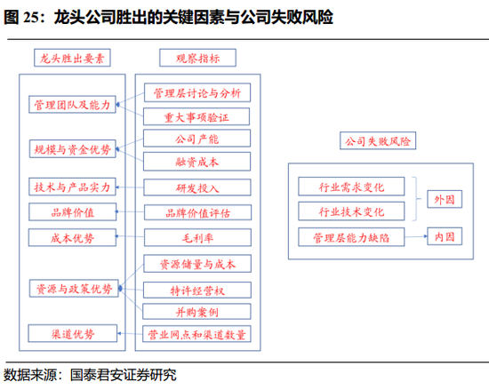 本章内容提要:管理团队及能力、规模与资金优势、技术与产品实力、品牌价值、成本优势、资源与政策优势、渠道优势是决定龙头公司在行业集中度提升中胜出的关键因素。通过对年报管理层讨论与分析的跟踪及重大事项的验证,对公司产能、融资成本、研发投入、品牌价值评估、毛利率、资源储量与开采成本、特许经营权、并购案例、营业网点和渠道数量等可观测变量的对比,我们可以判断公司在上述维度的竞争优势。与此同时,我们也应警惕行业需求变化、技术变化,以及公司管理层无法适应环境变化从而导致公司衰落的风险。下图展示了龙头公司胜出的关键因素及其观察指标,以及公司失败的风险。