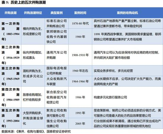 历史上并购对行业集中度提升起到重要作用,19世纪以来共出现5次并购浪潮。第一次并购浪潮出现在1883-1904年,横向并购产生了美国钢铁等垄断公司;第二次并购浪潮发生于1916-1929年,以通用汽车为代表的公司以纵向并购成为寡头;第三次并购浪潮(1965-1969年)中混合并购明显增加,1984-1989年的第四次并购浪潮则以敌意收购和杠杆收购为特征,第五次并购浪潮发生于1993-2004年,超大型并购数量较多,且并购浪潮从美国延伸至欧洲与亚洲。
