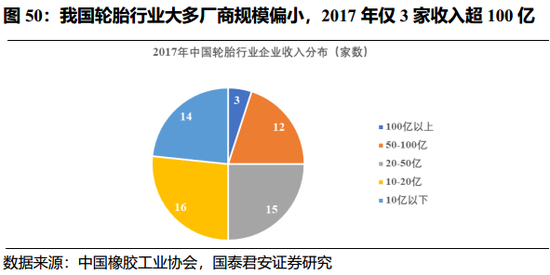 国内轮胎行业规模大,但行业整体比较分散。2018年中国汽车轮胎产量6.48亿条,但市场较为分散,从产量看CR4不足20%,从收入上看超过100亿的企业仅有3家,规模在50-100亿元的公司有14家,大多数厂商规模偏小,行业集中度有较大提升空间。未来以玲珑轮胎为代表的国内公司,通过发挥品牌价值、规模优势和成本优势,有望在行业激烈竞争进一步提高市占率,成为行业的龙头。