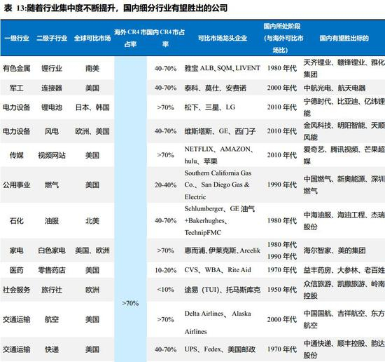 本章内容提要:我们以化妆品、券商、轮胎、面板四个不同板块的行业为例,通过复盘海外巨头的发展史,预判国内潜在龙头胜出的路径。对标海外,国内市场集中度提升空间广阔。我们梳理了76个未来集中度提升潜力较大的子行业,以及有望在行业洗牌中胜出的标的。
