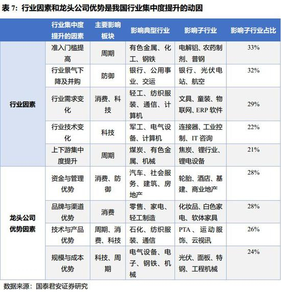 行业需求变化、行业准入门槛提高、行业景气下降与并购为促进我国行业集中度提升的3大行业因素。行业需求变化主要影响消费与科技行业,行业准入门槛提高主要影响周期行业,行业景气下降与并购对防御性行业的影响较大,行业技术变化对科技板块影响最大,上下游集中度提升对周期行业影响最大。