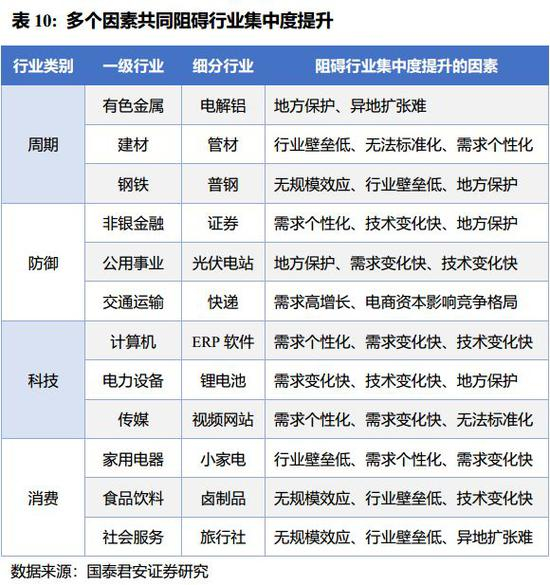 多个因素共同阻碍行业集中度提升。如普钢行业受到无规模效应、行业壁垒低、地方保护的影响,视频网站受到需求个性化、需求变化快和无法标准化的影响。下表列出部分行业的集中度提升的阻碍因素。