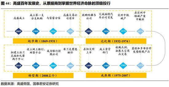 百年高盛,从票据商到掌握世界经济命脉的顶级投行。高盛成立于1869年,以票据贴现业务起家,1888年更名为Goldman,Saches& Co.。19世纪90年代,高盛成为全美最大的商业本票交易商,营收由1882年5万美元增长到1894年的6700万美元。1932年开始,高盛领导人从政,获得大额订单,发展再上新台阶。1975年机构投资者崛起,高盛业务重心从轻资产投行模式转向资本中介及资本交易等重资产业务,并于1999年在纽交所上市,逐渐进入成熟期;2008年金融危机之后,公司开始转型,成为银行控股公司,开始去杠杆并削减自营投资,布局金融科技。