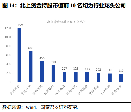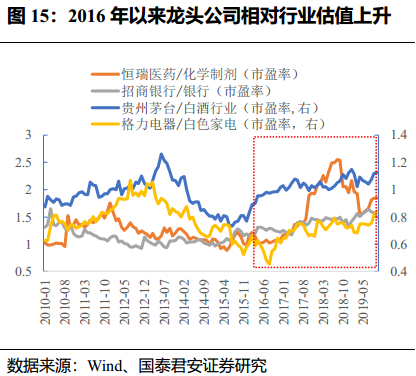外资重点配置龙头公司,龙头公司估值溢价上升。截至2019年11月,陆股通持股市值居前的公司为贵州茅台、中国平安、恒瑞医药、招商银行等,均为各自行业的龙头公司。2016年以来,随着外资加快流入A股,恒瑞医药、格力电器、贵州茅台、中国平安等龙头公司相对各自行业的市盈率持续上升。
