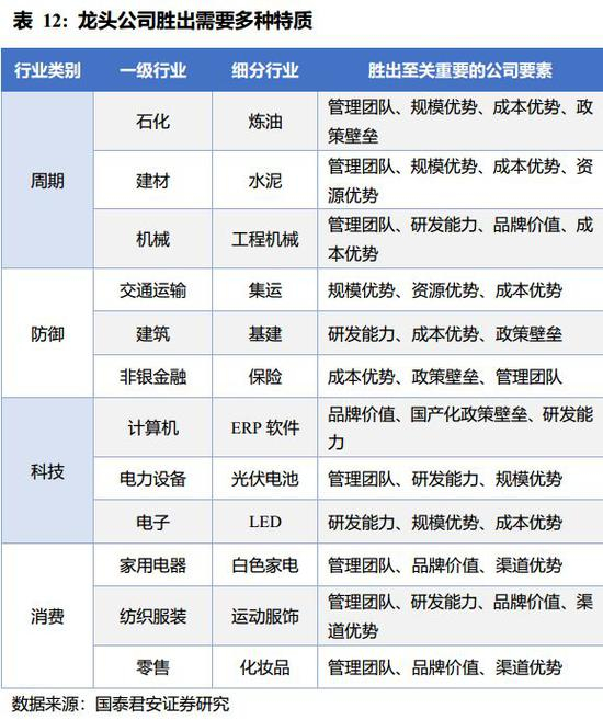 龙头公司胜出需要具备多种特质。如水泥行业需要管理团队、规模、成本和资源优势,运动服饰行业需要管理团队、研发能力、品牌价值、渠道优势。下表列出了部分行业龙头公司胜出需要的主要特质。