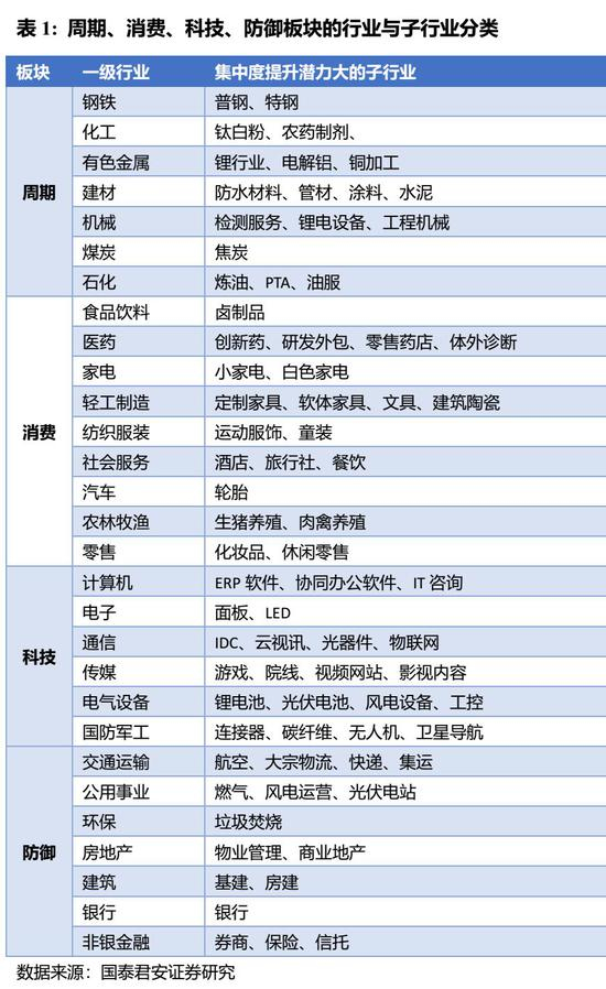 我们将行业归为周期、消费、科技和防御板块。我们将钢铁、化工、有色金属、建材、机械、煤炭、石化行业归为周期板块,将食品饮料、医药、家电、轻工制造、纺织服装、社会服务、汽车、农林牧渔、零售行业归为消费板块,将计算机、电子、通信、传媒、电气设备、国防军工归为科技板块,将交通运输、公用事业、房地产、建筑行业归为防御板块。在76个集中度提升潜力较大的子行业中,科技和消费板块均有21个行业,周期板块占18个,防御板块占16个。