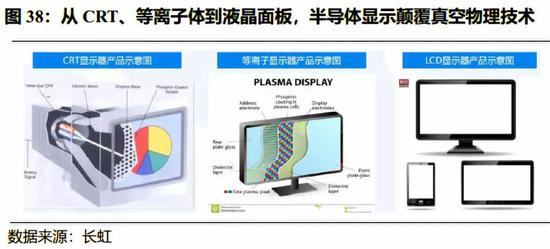 从CRT、等离子体到液晶面板,半导体显示颠覆真空物理技术。20世纪90年代,电视机采用CRT显示技术(阴极射线管,Cathode Ray Tube),是当时应用最广泛的显示器之一。21世纪后,以等离子显示、LCD(液晶,Liquid Crystal Display)技术为代表的平板显示步入生活中。起初等离子体和LCD相比具有亮度高,对比度高,可视角度大,颜色鲜艳和接口丰富等优点,市场一度争论以真空技术为原理的等离子显示和以半导体显示为基础的液晶显示,谁会成为市场主流,但最终半导体显示产业以技术优势彻底打败真空物理显示技术,LCD成为主流。