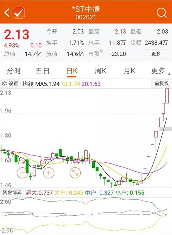 一类是已经连续涨停多日、走势十分喜人的个股。如,*ST中捷已狂揽7连板,*ST猛狮已收获6连板,ST罗顿和*ST仁智也收获了4连板。
