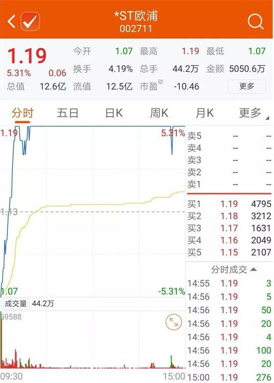 一类是今日上午开盘后不久开始猛攻封上涨停、具备连板潜力的个股。例如,*ST欧浦以跌停板开盘,开盘后快速上攻,封上涨停。同类情形的涨停个股还有ST威龙、*ST九有、*ST飞马、*ST赫美等。这些个股均为今日上午突然获得资金青睐、收获一个涨停。