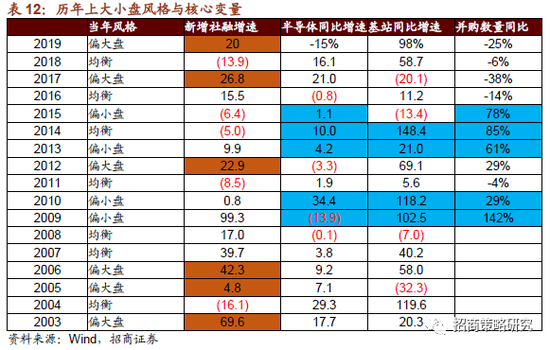 2003年、2005~2006年、2012年、2016-2017、2019年均是新增社融明显回升,社融对于企业盈利有着明显的领先作用。市场在经济预期改善,企业盈利预期回暖的环境下偏好大盘蓝筹风格。