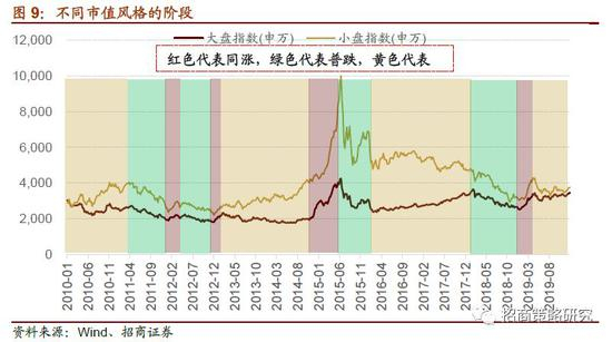 2010年,2013-2014年10月是典型的的小盘风格,小盘指数大涨而大盘滞涨,即便是同涨的2015年也是小盘指数明显跑赢;2015年下半年的反弹也是小盘指数明显跑赢。