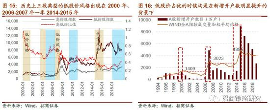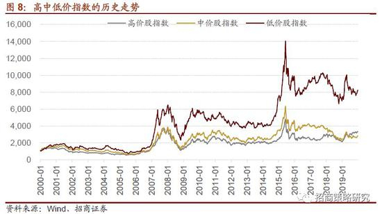 我们将高价股指数和低价股指数做比值后,2000年,2006H2-200H1年,2014-2015年低价股指数大幅跑赢,2005-2006H1,2009H2-2010,2018-2019高价股指数大幅跑赢。