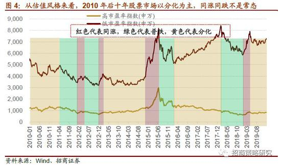 历史上,只有过三段时间,高估值风格显著占优的时间段是,2009年8月2010年10月,2013年至2014年10月以及2015年上半年,高估值涨幅较大,明显超过了低估值指数。而2019年则是低估值跑输。