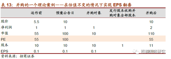 原因只有一个,那就并购,我们在此前的《壳价值的覆灭》中描述了这个原理,高估值以低估值并购上市公司,可以增厚EPS。我们举了一个例子,高估值并购一个低估值后可以在股价不变、PE不变的情况下实现EPS的增厚。