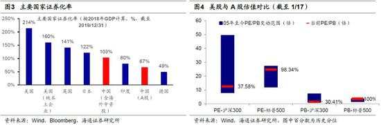 相比美股,A股估值更低。外资做全球资产配置,且持股期限较内资更长,选择全球洼地是重要视角,对比海外,A股吸引力很大。从资产证券化率来看,截至2019年12月31日我国的资产证券化率仅为67%(仅考量在A股上市的企业),即使考虑海外中资股,目前中国的证券化率也只有103%,远低于美国(214%)、英国(141%)、日本(122%)、印度(80%)等。对比海外市场尤其美股,A股已经非常有吸引力,沪深300目前PE(20/1/17,TTM)为12.6倍(处于05年以来由低到高的37.6%分位水平),而标普500指数为24.6倍(98%),沪深300目前PB(LF)为1.51倍(处于05年以来由低到高的30.4%分位水平),而标普500指数为3.61倍(100%)。从估值盈利匹配度看,2019Q3标普500净利润累计同比0%,PE(20/1/17,TTM)为24.6倍,沪深300 2019Q3年净利润累计同比10.5%,PE(20/1/17,TTM)为12.6倍,对应PEG为1.2倍,A股性价比同样较高。