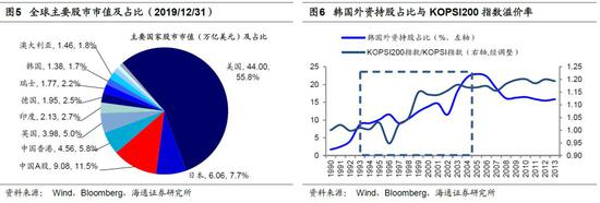 A股在各大国际指数中权重提高是必然趋势。市场之前对外资能否像去年流入那么多存疑,2019年中国A股以20%的纳入因子部分纳入MSCI指数(包括MSCI新兴市场指数),截至目前2020年后续纳A计划尚不明朗,我们认为外资对A股仍有很高的配置需求,A股在各指数中权重提高是必然趋势。从股票市值全球占比看,美国本土企业市值33万亿美元(截至2019/12/31),全球占比42.0%,美股市值44万亿美元,全球占比55.8%,相比之下A股总市值为9.1万亿美元,全球占比11.5%。但相比于A股全球股市市值占比,在全球主要指数中A股所占权重仍然较小,19年11月26日MSCI 完成了将A 股以 20%纳入因子部分纳入 MSCI 指数的最后阶段,在MSCI ACWI全球市场指数和MSCI新兴市场指数里的中国A股的比重分别达到0.5%和4%。相比于A股全球市值占比仍有很大提升空间。从外资性质看,过去两年A股在全球股指中权重提高,很多被动指数跟随资金进入A股,往后看主动管理资金也值得重视,随着中美第一阶段贸易协议达成,金融领域开放速度将明显加快,更多主动管理性质的外资将流入A股。参考中国台湾、韩国股市国际化的经验,中国台湾在2000年全面取消外资持股比例上限后,外资持股比例从2000年8.8%升至2007年25%,韩国外资持股比例从92年4%提高到2000年13.8%,中国台湾股市、韩国股市中外资持股比例在7-8年时间里分别提高了16.2个百分点、9.8个百分点,平均提高了13个百分点。假设未来我国资本市场对外开放的过程中外资持股占比(按自由流通市值计算,下同)每年提升1.5个百分点,今年预计有2500-3000亿元的增量外资流入A股。