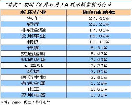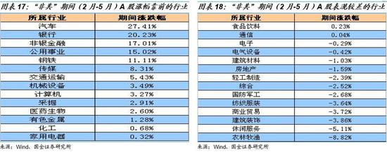 “非典”期间A股行业表现:2003年“春节”(2月)至5月底,A股上演“五朵金花”行情。涨幅靠前的行业分别为“汽车、银行、非银、公用事业、钢铁、交运、机械设备、采掘”等,正好对应了当时中国靠投资拉动的粗放型的经济增长模式。