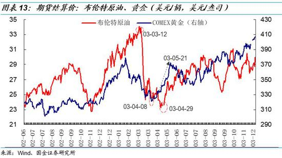 3)“非典”疫情对原油、黄金影响:阶段性冲击原油价格,避险促使黄金价格走高。原油价格回落时间大约持续1个半月,布伦特原油价格回落幅度约31.40%;避险情绪(唯有疫情严峻期)促使黄金价格阶段性上行,持续时间约1个半月,回升幅度15.52%。