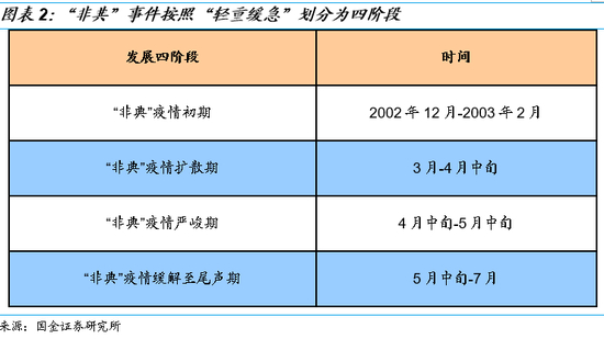 回顾“非典”事件,疫情从开始到结束持续大约6个月。我们按照该事件发展的“轻重缓急”划分为四阶段: