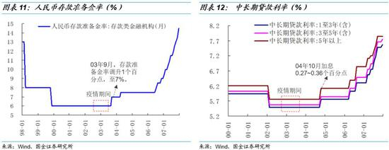 “非典”疫情结束后,因2003年下半年经济过热而调升存款准备金率。2003年9月,存款准备金率调升1个百分点,至7%。