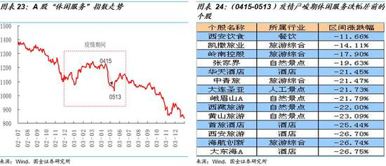 在疫情严峻期(0415-0513)区间休闲服务行业出现短暂急跌。其中“酒店、旅游、景点、餐饮”等细分子行业跌幅较大。