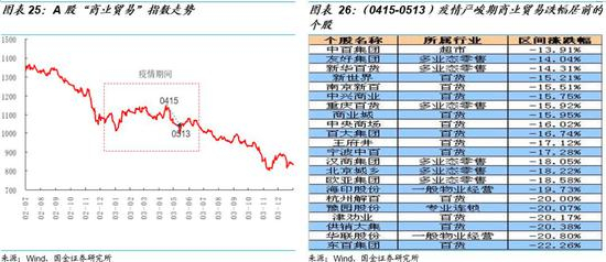 在疫情严峻期(0415-0513)区间商业贸易行业出现短暂急跌。其中“超市、百货、专业连锁”等细分子行业跌幅较大。