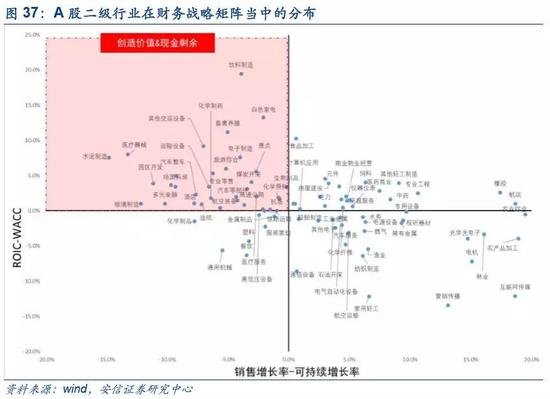 中期来看,我们认为经营性净现金流是主导行业比较的核心变量,而企业资本开支与自由现金流的变化具有一定的前瞻性(经营性净现金流-资本支出=自由现金流,)。那么,如何评价资本开支的有效性与自由现金流的充裕程度就显得尤其关键。因此,我们创新性地引入以价值创造(ROIC-WACC)和增长率(销售增长率-可持续增长率)为核心的财务战略矩阵对行业进行分析。