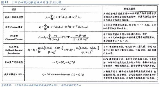 权益融资成本:从融资方的角度看股权成本。我们通常在计算权益融资成本时我们会站在投资者的角度考虑,即投资者要求的回报率,比如经典的红利折现模型,CAPM模型等。这些模型都是从资产定价的角度出发,计算出股票收益率,也即公司的股权融资成本。其中,CAPM模型应用较为广泛,但因为其理论假设较为严格,在个股的WACC计算中具备一定可操作性。但是,运用CAPM模型对行业的WACC的计算争议比较大,想要得到较准确的股权融资成本实操难度较大。因此,本文借鉴黄少安(2001)模型计算上市公司股权融资成本,该方法具备一定的理论基础且有较强的可操作性。