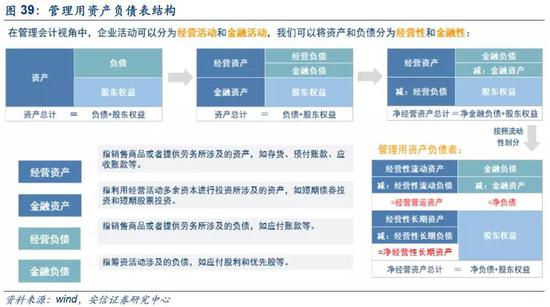 不同于会计报表,管理用资产负债表主要由经营资产、金融资产、经营负债与金融负债构成。其中,经营资产和经营负债主要针对于企业的经营活动,包括存货、预付账款、应收账款等指标。金融资产与金融负债则着重于企业进行与金融相关活动所产生的资产与负债,其中金融资产包括短期债券投资等,而金融负债则包括短期借款、长期借款、应付股利等指标。值得区分的一点在于,经营负债主要由经营活动产生,包括应付账款等,主要表现为无息负债,而金融负债则更多为有息负债。