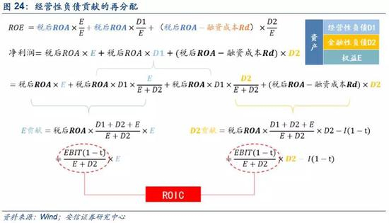 为何ROA无法得到相对准确的融资决策结果呢?回答这个问题之前,让我们对ROE进行拆分:可以看出企业的ROE由三部分组成,一是ROA,二是经营性负债的贡献,三是金融性负债的贡献。当ROE > ROA时,不难发现企业的融资活动确实能够给ROE带来正向地贡献,但如果我们认为ROA 就是衡量企业经营活动的准确指标,则意味着经营性负债的贡献将被视为融资活动的贡献,这与我们对经营性负债的观感是不相吻合的。因此,我们将ROA视作公司经营活动准确衡量指标的关键矛盾在于经营性负债的归属问题,我们不能将经营性负债完全归属于金融活动,虽然经营性负债本质上属于融资活动,但经营性负债来源于企业的经营活动,包括应付账款、应付工资等,它衡量了企业的商业信用,并且这部分负债是不计利息的。但另一方面,我们也不应将经营性负债完全归属于经营活动,经营活动的产生也离不开投资者的投入。