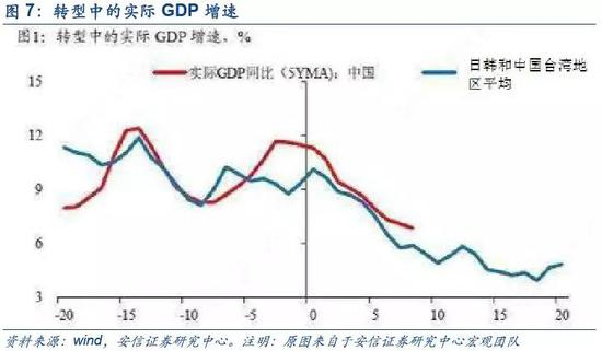 首先,根据安信证券研究中心宏观团队的研究,中国迄今为止的经济减速过程应该还没有结束。从日韩和中国台湾地区在转型结束后的平均增速在4-5%。2019年我国GDP增长6.1%,已经逼近6.0整数关口,在可预见的未来,我国经济增速依然趋于下行将是大概率事件。