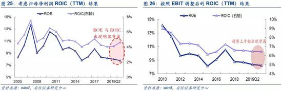 从当前数据来看, ROIC出现探底回升趋势,ROE仍处于下探阶段。以全部A股(非金融石油石化)为口径进行计算,2019年以来ROIC指标出现了一定程度地探底回升,尤其以归母利润为统计口径来看,2019Q3ROIC(TTM)由Q1的4.10%上升到了4.63%,而与之相对应的是ROE指标仍然维持下滑的趋势。同时,我们以利润总额为口径的测度结果来看,ROIC基本维持走平趋势,ROE(TTM)仍处于下降趋势。