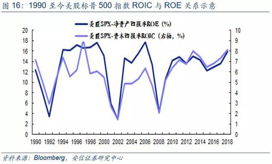 这点在美股2008年之后的去杠杆过程中体现的尤为明显,高ROIC带来了高ROE,且ROIC不会受到回购的干扰。我们以标普500为例,在美股2008年去杠杆之后,ROE的回升主要是靠ROIC在作为支撑。需要提醒的是大量股份的回购或分红可以使得ROE长期保持在高位,而ROIC则更着重于企业本身利用其所拥有的资源创造的价值,且美股回购对于ROIC作用有限,原因在于ROIC的分母是净经营资产,并不受回购的影响。具体而言,如果企业加大回购,则分母项当中尽管总资产和减少,但由于回购需要消耗企业可支配现金即金融资产,因此分母项两项变化相互抵消,回购不会“人为”对于ROIC指标产生抬升效果。