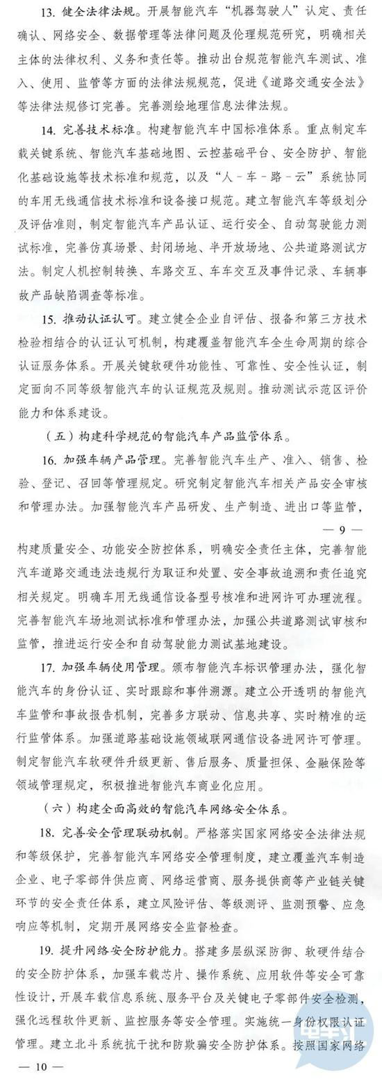另外,通知中也强调,为了实现这一目标,目前的主要任务是突破关键基础技术、完善测试评价技术、开展应用示范试点、增强产业核心竞争力、培育新型市场主体、创新产业发展形态、推动新技术转化应用、推进智能化道路基础设施规划建设、建设广泛覆盖的车用无线通信网络、建设覆盖全国的车用高精度时空基准服务能力、建设覆盖全国路网的道路交通地理信息系统、建设国家智能汽车大数据云控基础平台、健全法律法规、完善技术标准、推动认证认可、加强车辆产品管理、加强车辆使用管理、完善安全管理联动机制、提升网络安全防护能力、加强数据安全监督管理。