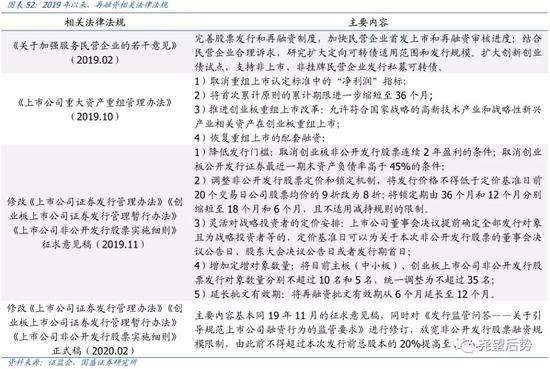 2020年初,定增修订正式落地,定增回暖可期。历时3个月的公开征求意见后,证监会于2月13日正式发布《关于修改<上市公司证券发行管理办法>的决定》《关于修改<创业板上市公司证券发行管理暂行办法>的决定》《关于修改<上市公司非公开发行股票实施细则>的决定》。此次修订实现了发行制度的多项放松:1)精简发行条件,拓宽创业板再融资服务覆盖面;2)优化非公开制度安排,支持上市公司引入战略投资者。上市公司董事会决议提前确定全部发行对象且为战略投资者等的,定价基准日允许多元化自主选择;3)调整股票定价和锁定机制,允许发行定价低至参考价的8折,锁定期也由此前的36个月和12个月分别缩短至18个月和6个月;4)发行对象数目限制放宽:主板(中小板)、创业板非公开发行股票发行对象数量由分别不超过10名和5名,统一调整为不超过35名;5)适当延长批文有效期,方便上市公司选择发行窗口,将再融资批文有效期从6个月延长至12个月。自此,主要定增规定放松程度基本回归至2014年爆发期的水平,而且增发对象、批文有效期等部分条款还得到了进一步放宽,定增政策放松力度达到有史以来的高位。未来伴随政策放松细则的相继落地,定增实施回暖可期。