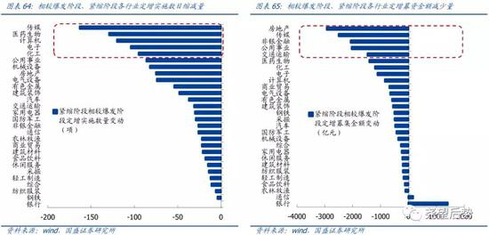 同时,经历了前两年政策收紧,哪些行业定增融资需求最受压制?我们对比了定增紧缩阶段与爆发阶段的实施情况:紧缩阶段定增数回落最多的前5大行业分别为传媒、医药生物、计算机、电子和化工,募资规模降低最多的前5大行业分别为房地产、传媒、非银金融、公用事业和交通运输。在新一轮放松周期中,上述板块的融资需求有望集中释放。