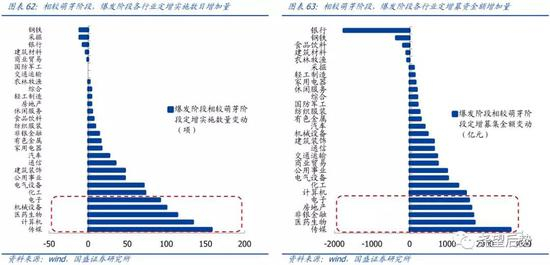 爆发期定增行业分布更多偏向TMT与医药生物。定增集体爆发阶段内,传媒、医药生物和计算机位列前三甲,分别为207项、182项和175项。资金募集规模方面,除传统的金融地产外,传媒、医药生物、化工和电子行业的融资规模也快速抬升,处于行业前列。